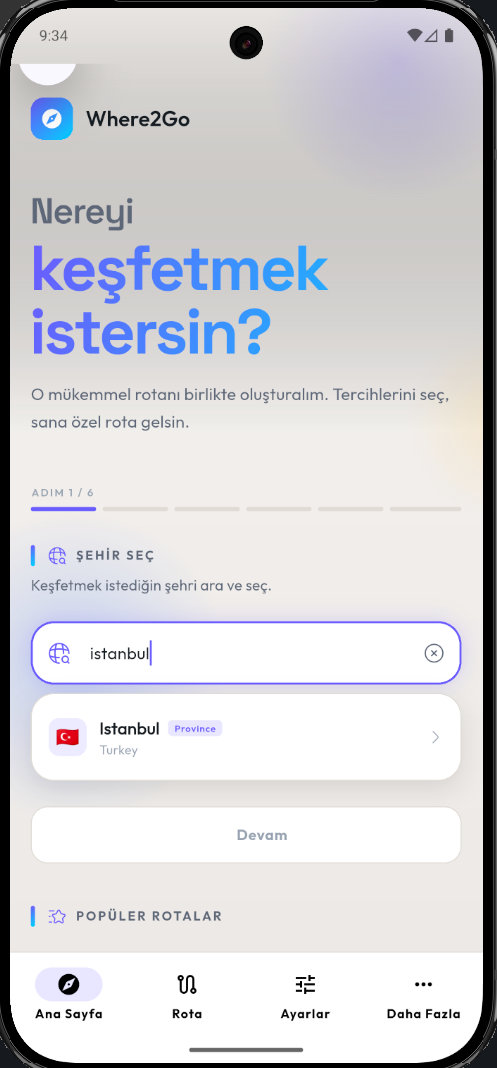 Akıllı seyahat asistanınız. Sadece tarih ve şehri seçin, gerisini bize bırakın. Kişiselleştirilmiş rotalar ve keşif noktaları.