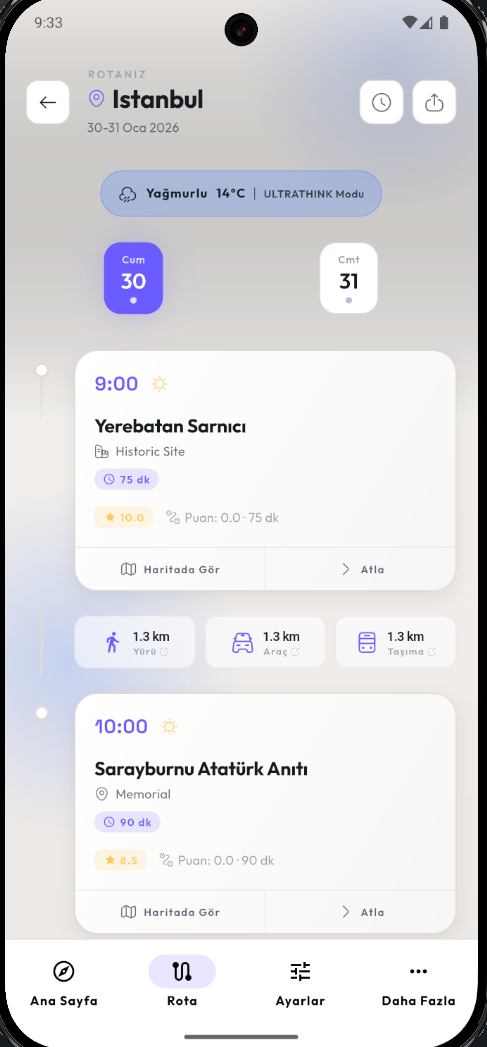 Siz sadece şehri ve tarihi seçin. Uygulama, ilgi alanlarınıza göre saniyeler içinde mükemmel rotayı oluştursun.